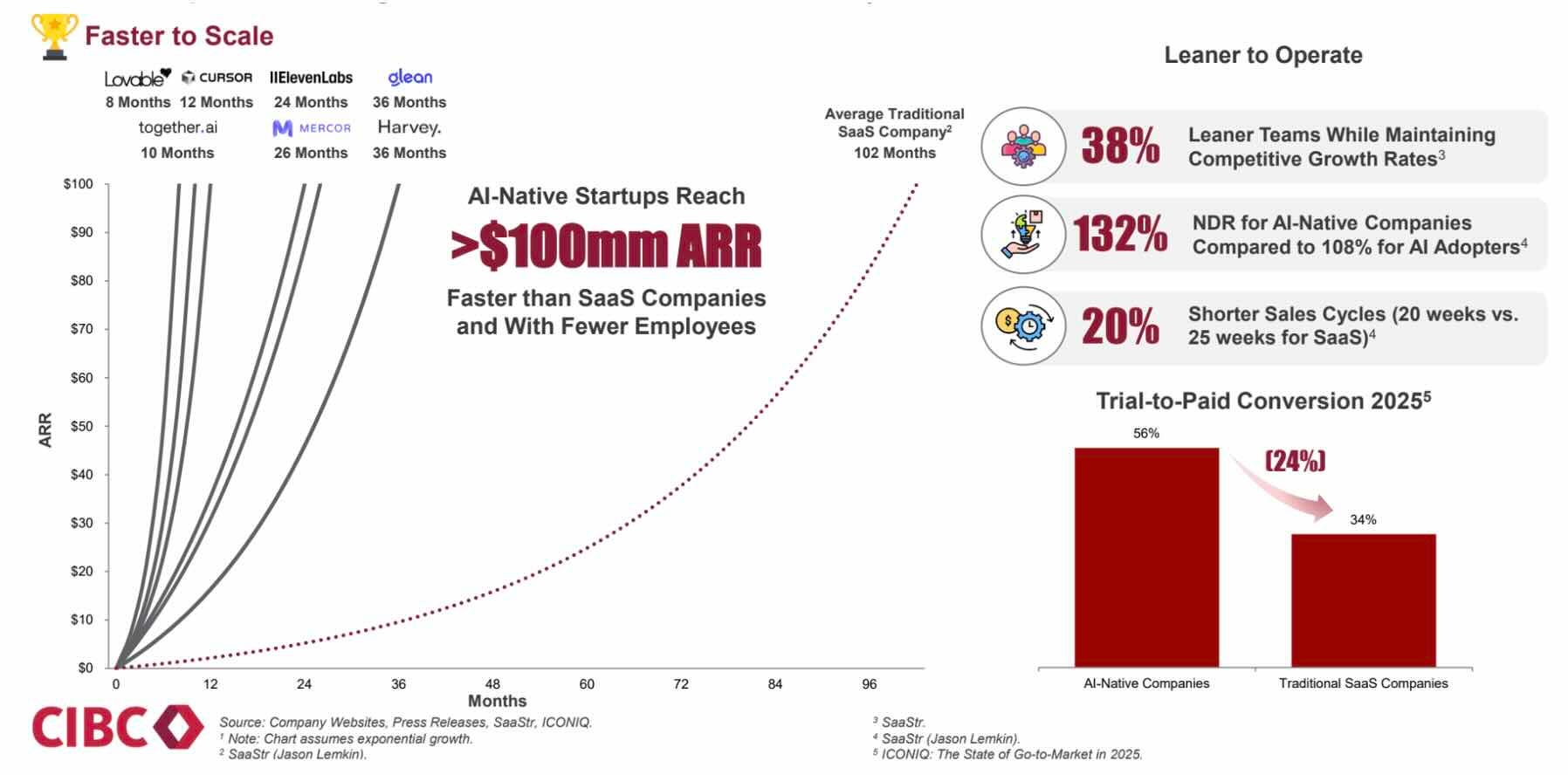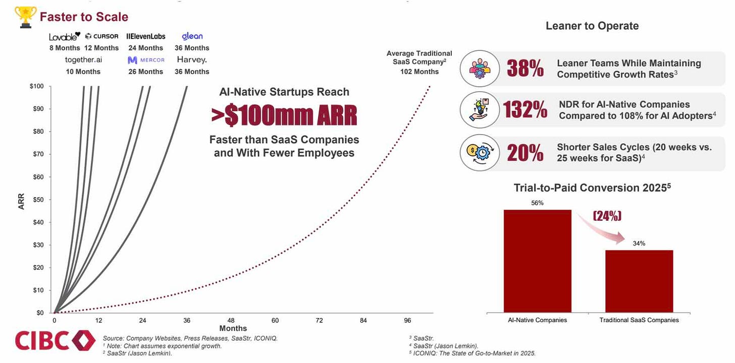 2. AI-native companies get to $100 million in ARR faster than traditional SaaS vendors and do so with smaller teams, shorter sales cycles, and higher trial-to-paid conversion rates, according to data compiled by financial institution CIBC.