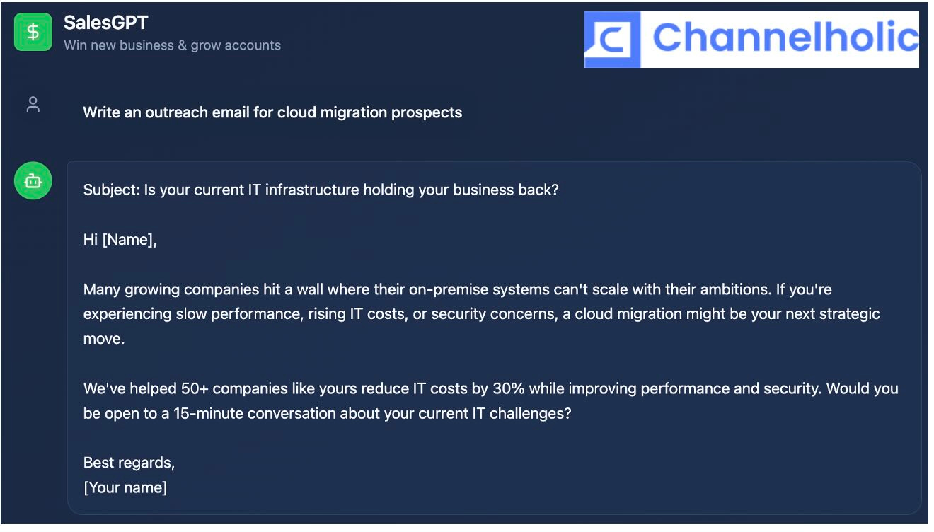 There are five in all at present for sales, marketing, ops, security, and HR that partners can use to write emails, build marketing campaigns, prepare for a QBR, role play sales meetings, and more. Each one, Rose emphasizes, is pre-trained on knowledge she’s accumulated across two decades of work as a consultant, author, speaker, and founder of organizations like channelWise and The Channel Marketing Association, which introduced an AI assistant tool of its own last week called ChannelGTM.ai.