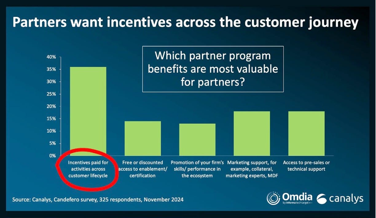 1. Points-based reward systems. In older programs, vendors rewarded sales volume and certifications with dollars, in the form of discounts or commissions typically. Newer ones reward a broader range of activities across the lifecycle of a deal, something partners crave, per data from Canalys: